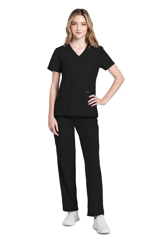 A v-neck top with built-in functionality elevates basic v-neck styling. There is a dyed-to-match flat bungee on the neckband for an ID badge loop. There are two roomy patch pockets with a reverse hem trim. Side vents at hem for ease of movement. Decorative tonal topstitching adds the finishing touch to this scrub top. Modern Classic fit. Center back length: 26"