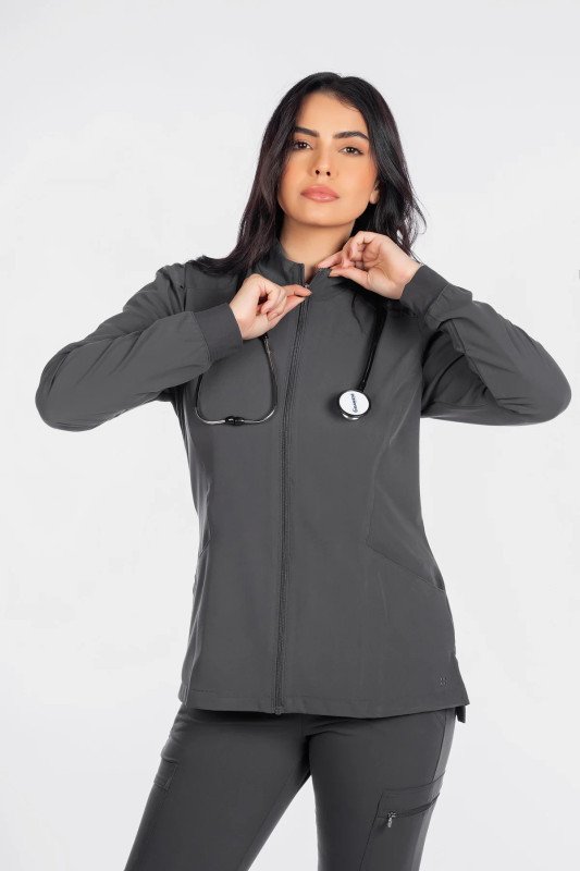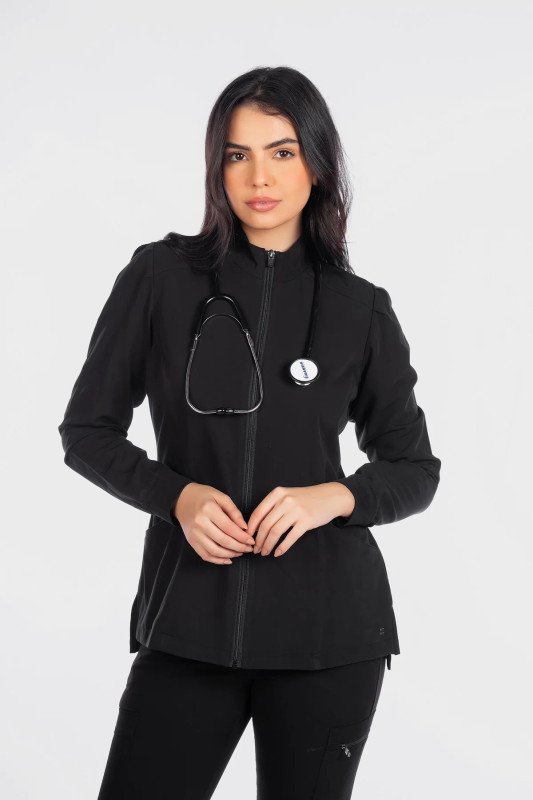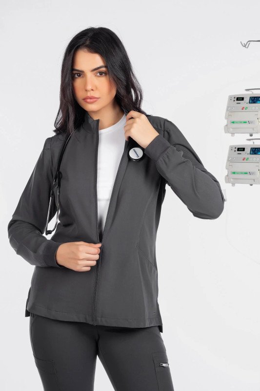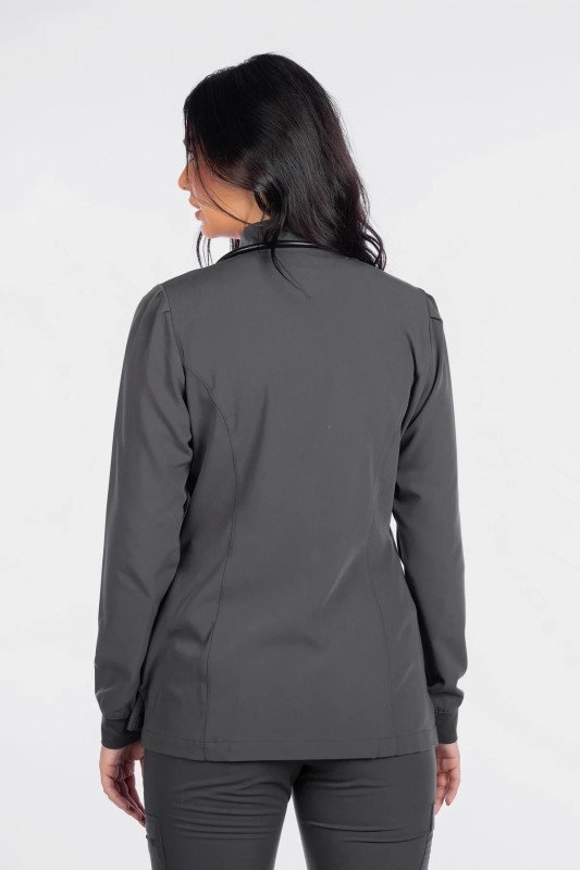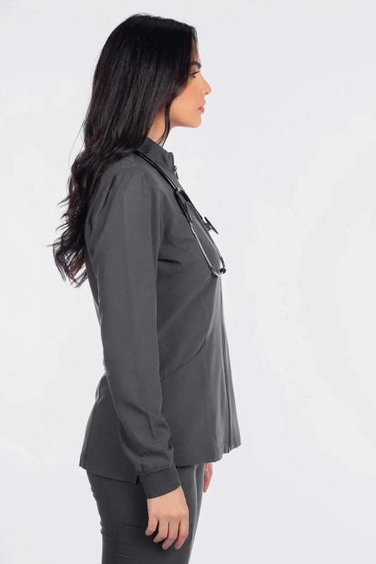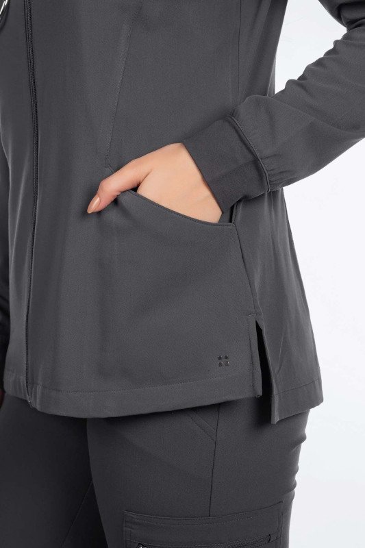 This Modern Fit zip front jacket will keep you stylish in-and-out of the workplace. The mock neck and pleats at the sleeves give this fashionable jacket a feminine touch. Features cozy knit cuffs, front and back princess seams, 2 front pockets, and a hi-low hem detail with side vents for an easy fit.